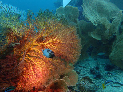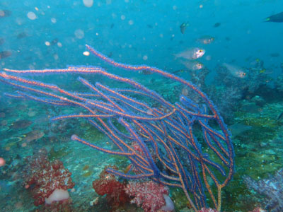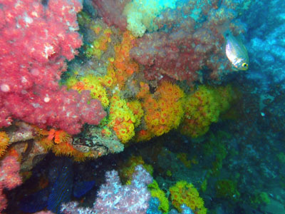 これはタートルロックのソフトコーラル、後ろにはキンセンフエダイの群れが雲のようでした。