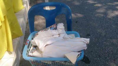 お堂の前には、白い布がかごに入っておかれています。
