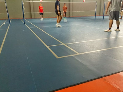 中に入るとコートは6面あって、ビックリするのはバドミントン専用のラバーが敷いてあるんですね。