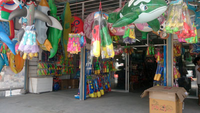 こちらは街のおもちゃ屋さん。ビーチで遊べる浮き輪などと一緒に