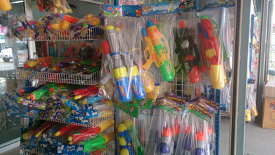 プーケットタウンの大型スーパー「ロータス」のレジの前には、こんな水鉄砲がすでに山積みにされていました。どれも大きいでしょ!