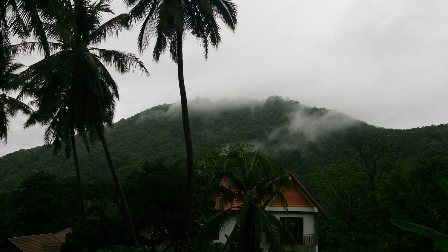 うちの部屋から見える山。本当はこの頂上にビッグブッダが見えるのですが、今朝は霧がかかっていて仏様は拝めません。