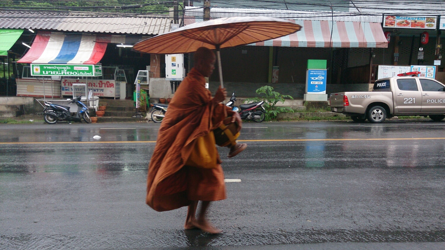 食べ物を受け取った後、お経をあげるときはどうしても傘をさせないので、濡れてしまうのが大変そうに見えました。
