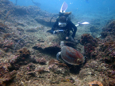 ウミガメに出会って、大きなコブシメの三角関係を眺めて