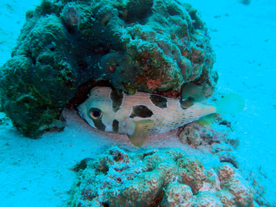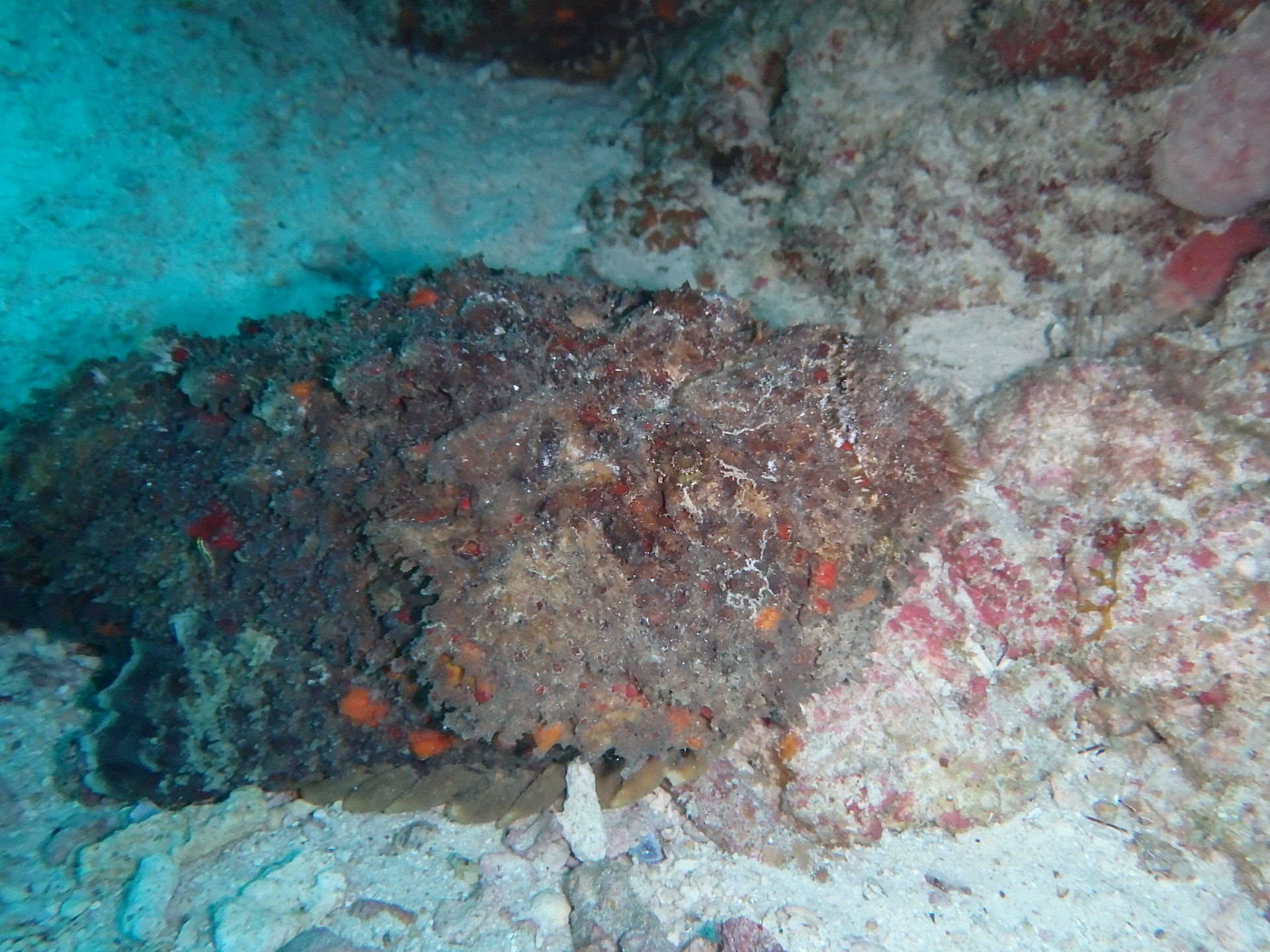 小さな根を覗くと、大きなオニダルマオコゼがいました。