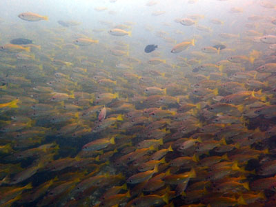 少し暗がりの中に群れるフエダイとソフトコーラル