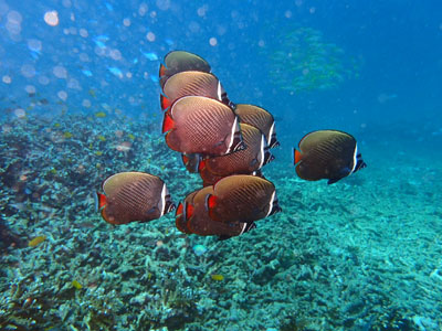 リュウキュウキッカサンゴの上にホソフエダイの群れはとてもキレイです