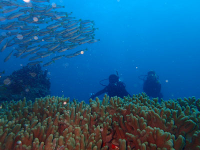 こちらはサンゴとホソフエダイの群れ