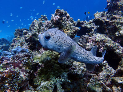 ダイバーに近づいてくる人懐っこいネズミフグです