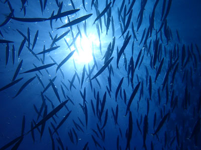 青い背景をバックにカマスの銀色の身体がキラキラ光っていました