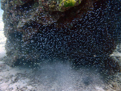 ちょっと動きの鈍くなったチョウチョウコショウダイの若魚や