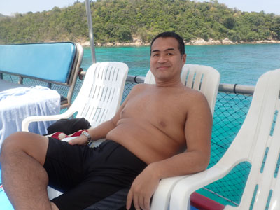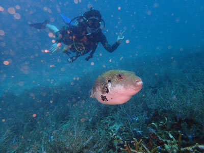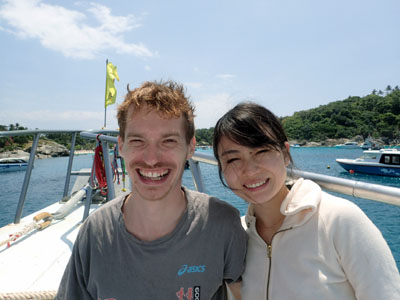 そんなお二人と潜ったラチャヤイ島。波は無くて、いい天気だったのですが、海の色は緑色で透明度がもう一つでしたが、それでも魚を沢山見て頂きました。